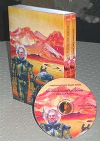 besteht aus drei Teilen, die in einen stabilen DIN A5-Schuber mit einem umlaufenden Bild von Johnny Bruck (Cover von Perry Rhodan-Roman Nr. 1600) verpackt sind: